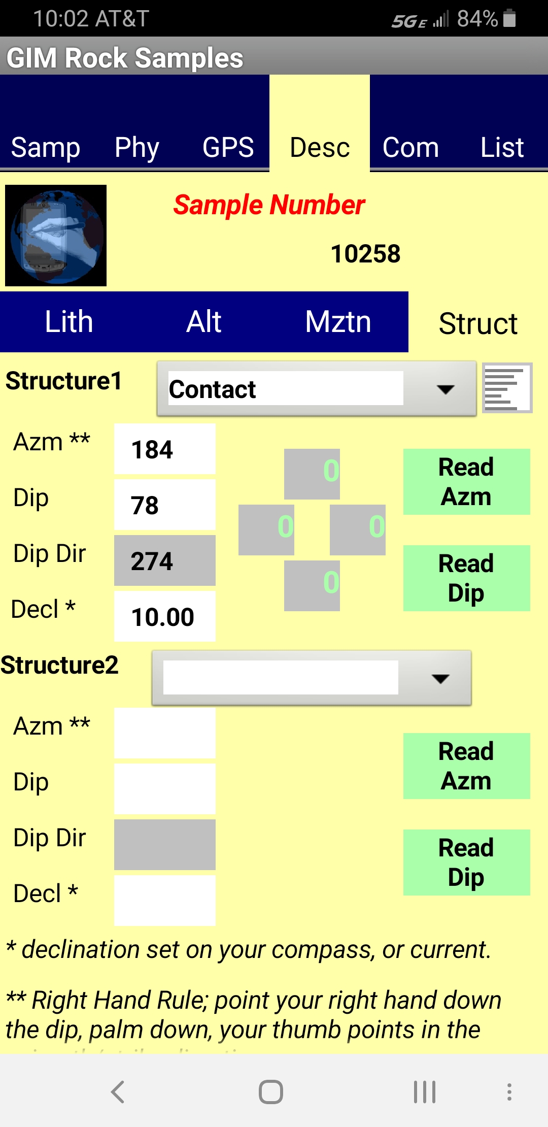 • Compass, read azimuth and dip for structures and surveys